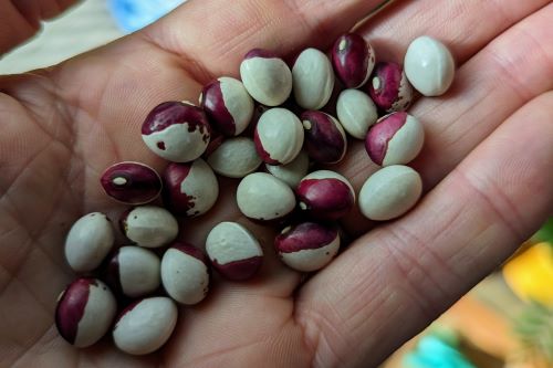 Seed Story: Drying beans are great, as they’re a fantastic source of protein, especially if you’re following a plant based diet. They’re tasty, healthy and can be stored for a long time without the need for complicated, high energy processing. You can dry pretty much any bean, but borlottis are my personal favourite as they’re not too big and have thin skins which means a velvety smooth texture when you cook with them later on. They’re great in soups, casseroles and chillies, and in my opinion, make the ultimate home made baked beans. They look fantastic in your garden, with their mottled coloured pods; and the speckled beans themselves are beautiful. A friend of mine once said they look like tiny dragons’ eggs! This particular Welsh variety of the Italian borlotti is suited to our cool, wet climate here in the south west. Back in the late 1900s an old lady in Cardiff gave some seeds to her district nurse, and the variety has been kept alive by local gardeners ever since, gradually adapting to the climate. It is now only available in seed libraries and from a handful of small seed companies. The plants themselves are tall and bushy with lime green leaves, pretty lilac flowers and pods splashed with dark purple.