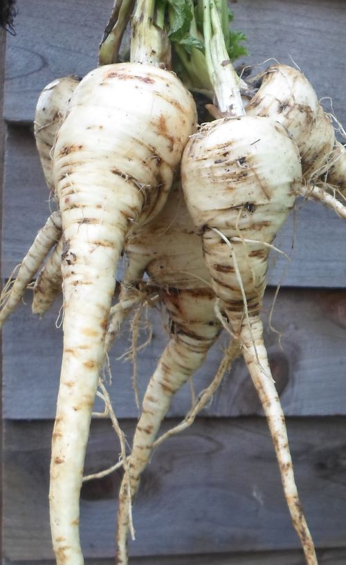 Parsnips can be a little slow and erratic to germinate, but once they’re off, they need little maintenance and can be left in the ground until you’re ready to eat them.  Most gardening books say you need to direct sow, so if you’re doing this, you’ll need to wait until the soil is has warmed up, normally in mid-spring.  Make a shallow drill, then sprinkle the seed along it – you can use plenty, not only because of the tricky germination, but also because parsnip seed doesn’t keep well, so best use it all and buy fresh each year.  Cover with soil and water in.  Don’t add any organic matter otherwise your roots will end up ‘forking’.  Germination can take up to 30 days, so keep them well weeded so you can easily see when they start to appear, then thin to approx 6” spacings, when they’re about 1” high.