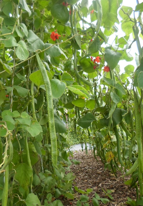 Not quite as hardy as french beans, start your runners off indoors in late spring and don’t plant out until early summer as the soil won’t be warm enough before that.  They’ll need a need a slightly larger spacing too – about 9” to 1ft.  Plants can get quite heavy towards the end of the summer, so will be susceptible to strong winds – a good, firm support structure is therefore vital.  Pinching out the tops once they have reached to top of the structure will stop them getting too top heavy, and will encourage bushier growth, so more beans!